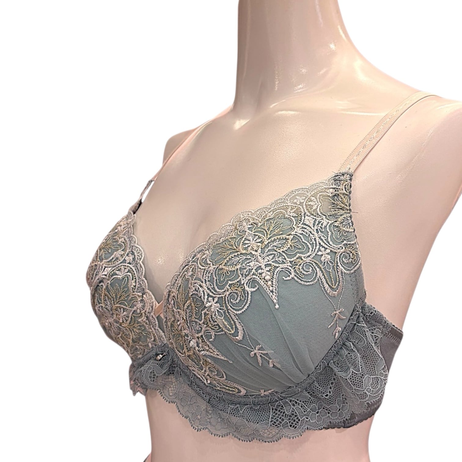 シンプルな下着では物足りない、でも派手すぎるデザインは避けたい…そんな方にぴったりのブルーグリーン刺繍ブラセット。落ち着きのあるブルーグリーンに繊細なゴールド刺繍をあしらい、大人の華やぎを演出します。軽やかなレース仕様で通気性も良く、快適な着け心地を実現。デイリー使いはもちろん、特別な日や気分を上げたい日にもおすすめです。レビューでは「高級感のある色味」「品があって肌映えする」と好評。上品さと安心感を兼ね備えた一着です。