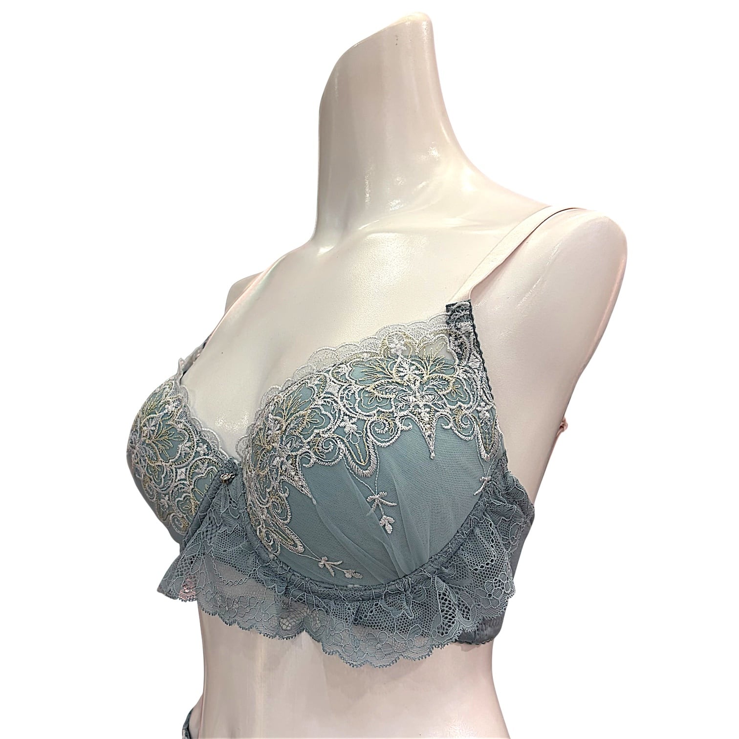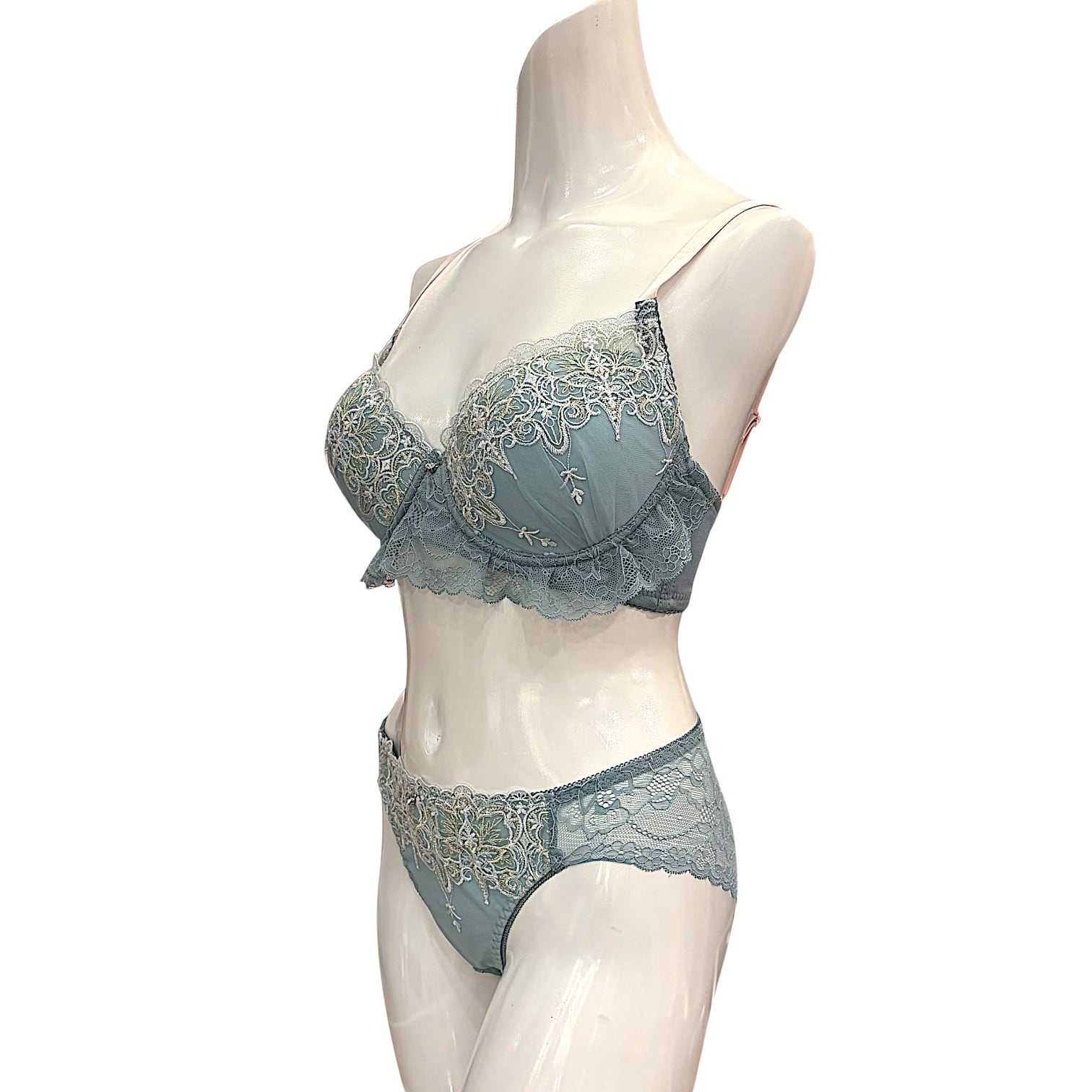 普段の下着に物足りなさを感じる方へおすすめの、フリル刺繍ブルーグリーンセット。落ち着きのあるブルーグリーンに繊細なゴールド刺繍を施し、さらにアンダー部分には上品なフリルをあしらいました。華やかさと可憐さを両立し、大人の女性に似合う特別なデザイン。軽やかなレース素材で通気性も良く、快適な付け心地を叶えます。普段使いにはもちろん、特別な日や気分を高めたい時にもぴったり。レビューでは「フリルが可愛いのに上品」「肌映えして気分が上がる」と好評の一着です。