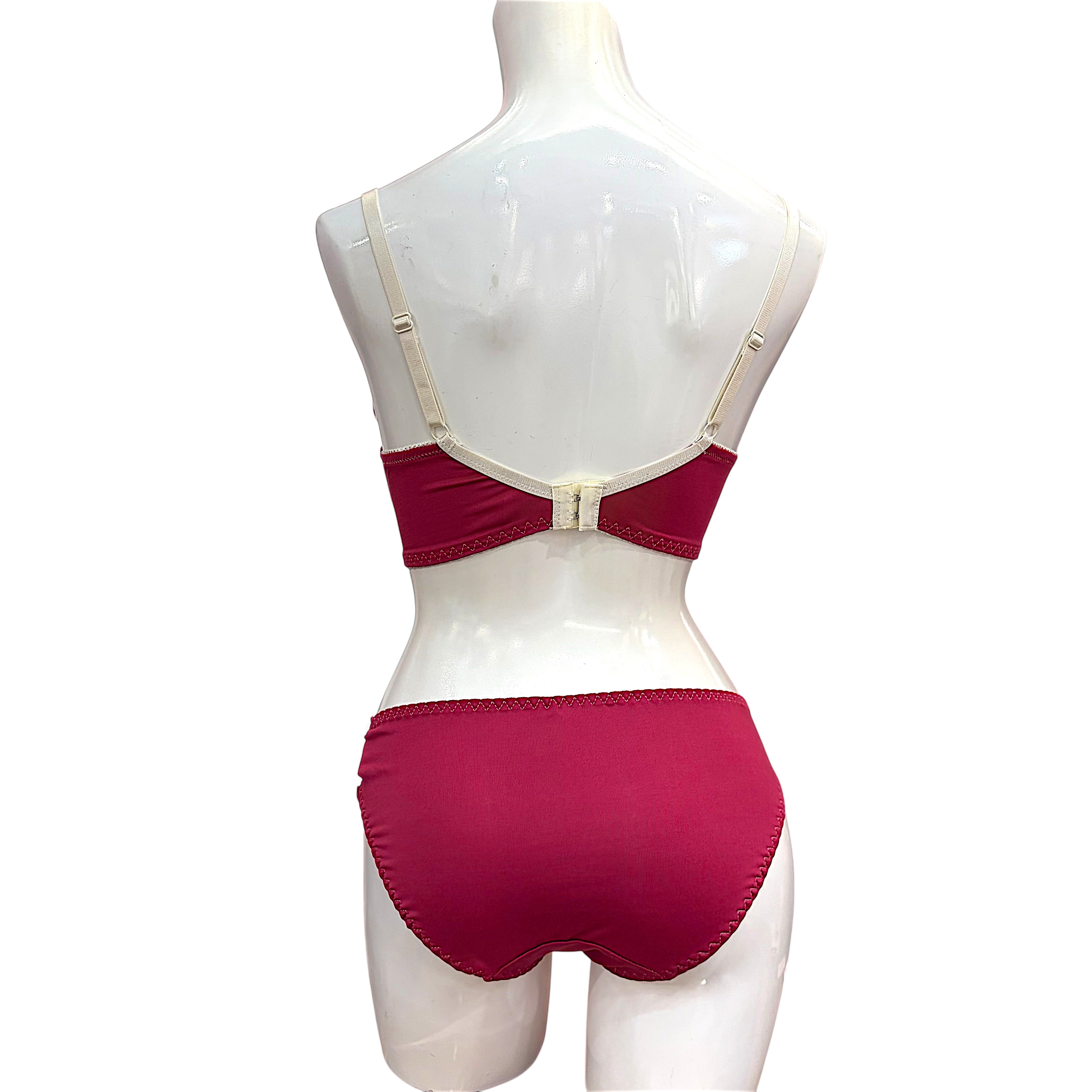 上品なレッドとアイボリーのコントラストが美しい、ノンワイヤータイプのブラ&ショーツセット。