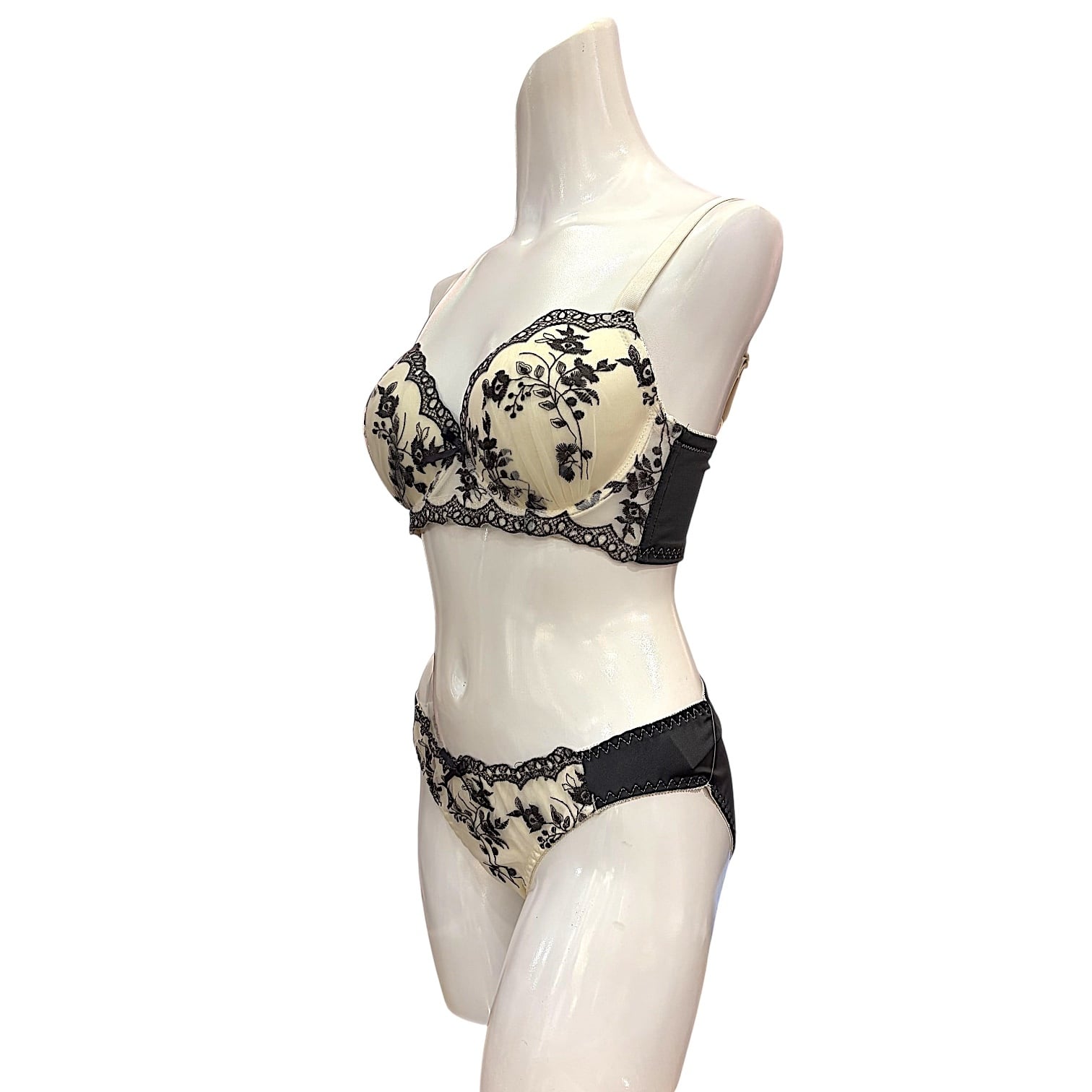 上品で落ち着いた印象を与える黒刺繍レースのブラ&ショーツセット。アイボリー地に映える繊細なフラワーモチーフが、大人の女性らしい優雅さを演出します。立体カップがバストをしっかり包み込み、自然な谷間をメイク。バックホック仕様で安定感もあり、長時間の着用でも快適なフィット感をキープします。ショーツはストレッチ素材で動きやすく、日常使いにもおすすめ。特別な日にも普段にも活躍する、美しさと機能性を兼ね備えたランジェリーセットです。人気の刺繍デザインで気分まで華やかに。